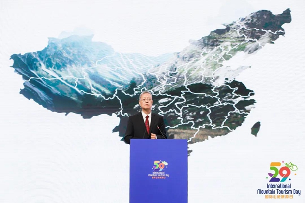 世界自然保护联盟(IUCN)理事会主席章新胜致词:“疫情后,如何化危为机转型升级呢?可持续发展,山地旅游和生态旅游融合发展是重要的选择。”
