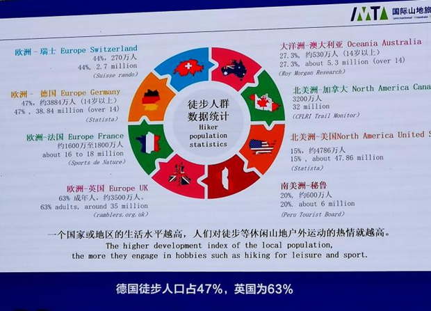 “这表明中国的徒步游活动具有巨大的发展空间。中国的休闲、运动和旅游徒步对社会经济的发展具有巨大的杠杆作用。”高宁说,德国徒步人口占该国总人口的47%,英国为63%,美国占15%,澳大利亚为27%,加拿大为85%,日本为8%。“这里谈论的是户外天然步道的徒步,而非大众旅游,大众旅游常常是在从无到有的人造步道上散步,需要支付门票才能入内。”他说。