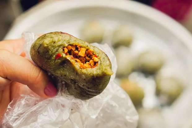 又名清明粑,最初用于清明节供奉先祖,现在一年四季都能吃到。采糯米、蒿菜叶子制作面团,外皮软糯有嚼劲,带着野草的清香。喜欢甜口的食客可以选择芝麻糖馅,喜欢咸口的可选豆腐肉沫。