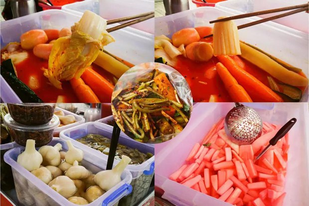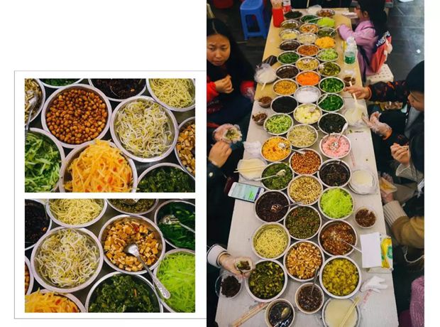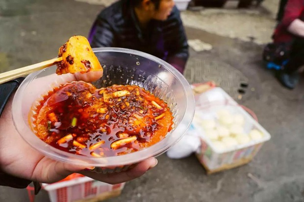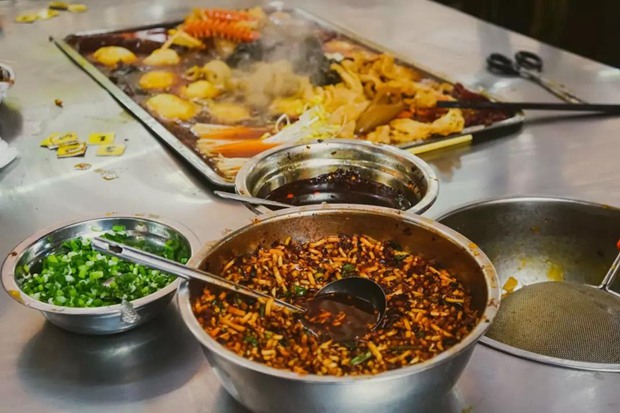 不同锅代表着不同口味,原味、麻辣或酸辣。各种食材在锅里噗噜噗噜,有素有肉有主食,老板用一大剪刀把食材剪成小块再放顾客碗里,蘸水辣椒品种也很多,价格实惠,是全年都广受欢迎的小吃。