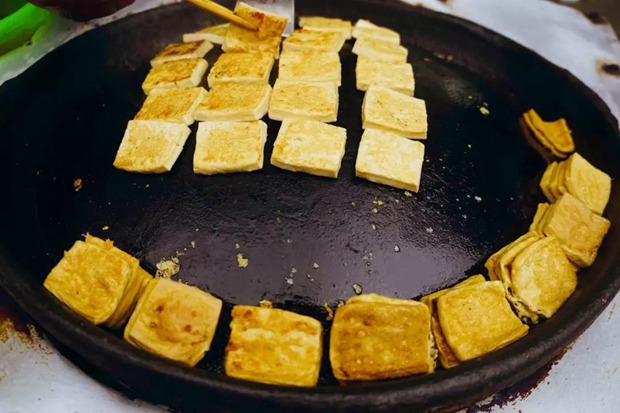 铜仁街边常见这种推车叫卖的小豆腐,煎得两面略焦黄后蘸辣椒面吃,一口一个停不下来。贵州人就是什么都可以蘸辣椒吃。