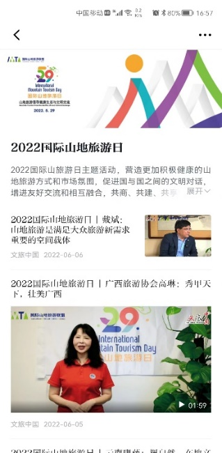 5月21日—5月30日,作为文化和旅游部官方新媒体客户端——文旅中国专题采访了全球17个山地主题活动。采访对象从体育局、艺术中心、旅游集团领导到营地、房车、户外装备创始人,再到户外急救专业人员、户外体裁影视剧拍摄导演等,从多个角度介绍山地旅游,为主题活动赋能。文旅中国客户端还推出了2022国际山地旅游日“山地旅游倡导健康生活与文明交流”主题倒计时海报开机屏。28篇重量级报道引起网友共鸣,大众期待山地旅游得到广泛推广,阅读量达到683万。