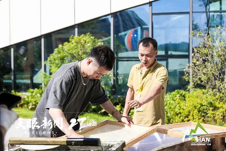 在山地生活与非遗传承展上,非遗传承人穿针引线,把“蝴蝶妈妈”的故事“写”在衣裙之上;把竹篾成“丝”,编成竹篓、竹筐、竹篮;抄纸、晒纸、揭纸,巧手还原《天工开物》里的造纸法……