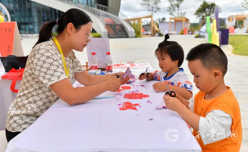 俩小孩在剪纸艺人的指导下体验制作剪纸。