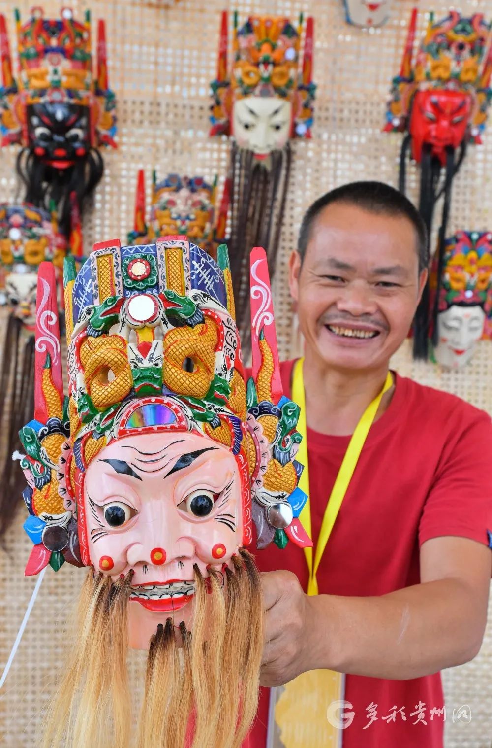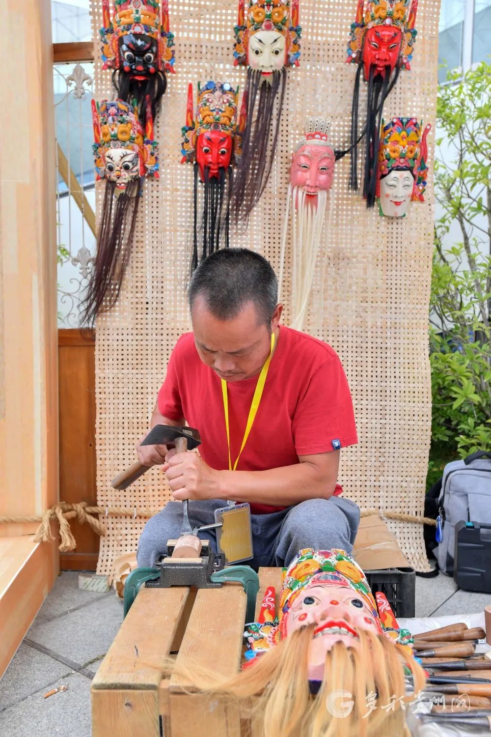 木雕艺人展示木雕地戏人物脸谱工艺品。