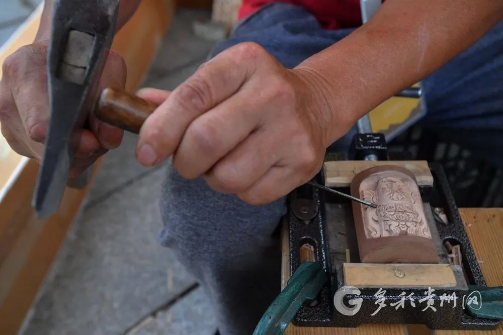 木雕艺人在制作微型木雕地戏人物脸谱工艺品。