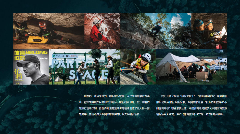 出发吧开创了包括“超级大秋千”“商业洞穴探险”等数项极限运动项目的行业新标准,全国首家开启“职业户外教练60小时魔训考核”职业素质认证。中国体育总局授予《中国体育旅游精品项目》荣誉,荣登《体育博览》457期、478期封面故事。