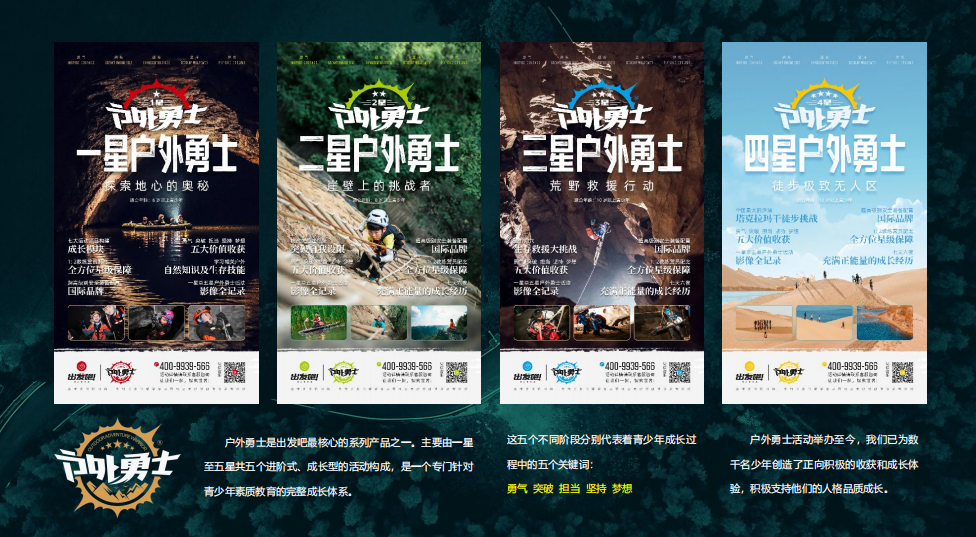户外勇士是出发吧最核心的系列产品之一。主要由一星至五星共五个进阶式、成长型的活动构成,是一个专门针对青少年素质教育的完整成长体系。这五个不同阶段分别代表着青少年成长过程中的五个关键词:勇气、突破、担当、坚持、梦想。