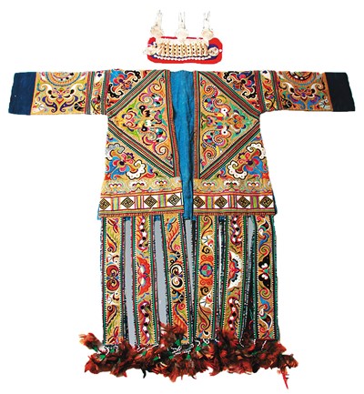 贵州是中国苗族人口最多的省份,苗族又是贵州人口最多的少数民族,其族人遍布全省。走进苗族展区,互动电子屏上显示了苗族5次大迁徙的时间、路线,展柜里陈列着从各地征集而来的苗族服饰、银饰、木鼓等。一件华丽的百鸟衣吸引了记者的目光。这是贵州榕江地区苗族男子参加牯藏节等隆重祭祖典礼时所穿戴的盛装。衣服周身绮丽的鸟纹图案反映了苗族鸟崇拜的观念,寄寓了民族兴旺繁衍的愿望。