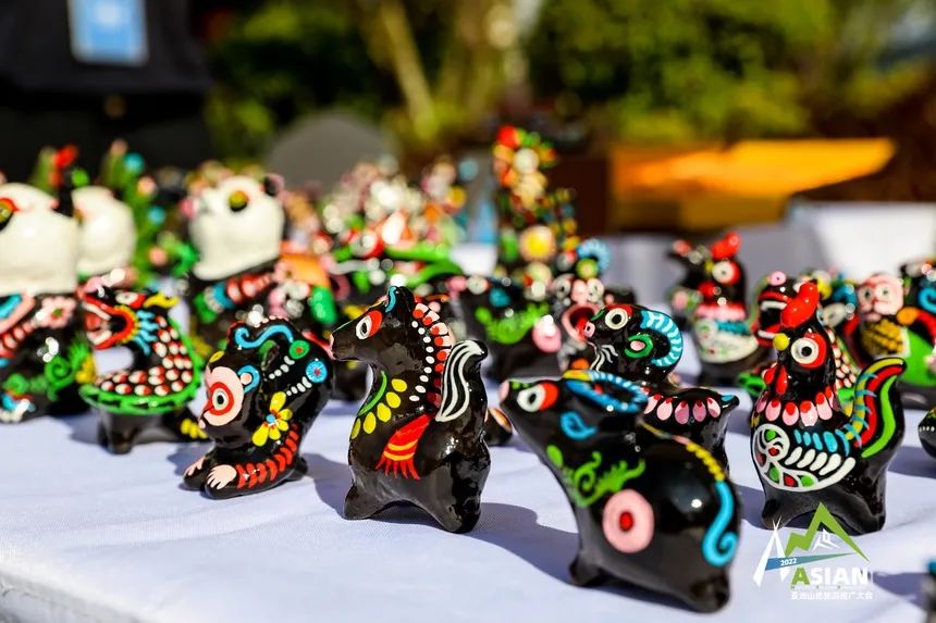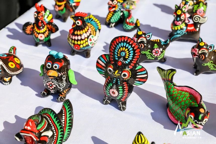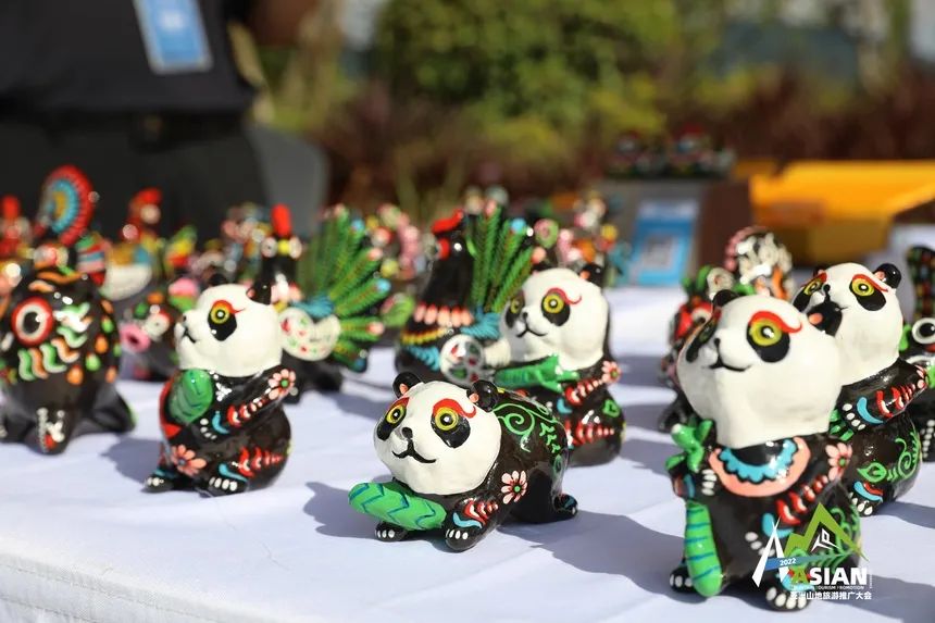 在山地生活消费和非遗传承展上,国家级非物质文化遗产代表项目黄平泥哨一经亮相,形态各异、五彩斑斓、憨态可掬的黄平泥哨作品便吸引人了众多观展观众、嘉宾以及媒体的目光,生动的小猴子,可爱的小老虎,远远望去就像在向人招手,国宝级动物大熊猫被塑造成了不同状态,异常讨人欢喜,引得观众纷纷驻足停留。