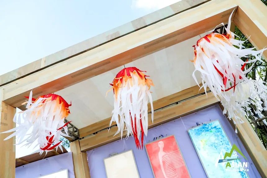 整个非遗传承展区中,阵场最大的当属丹寨石桥古法造纸的展位,展架上方飘着三个纸艺花灯,柔韧的纸张染成红白渐变的颜色,裁剪成条状,在风中灵动如优美的凤凰。