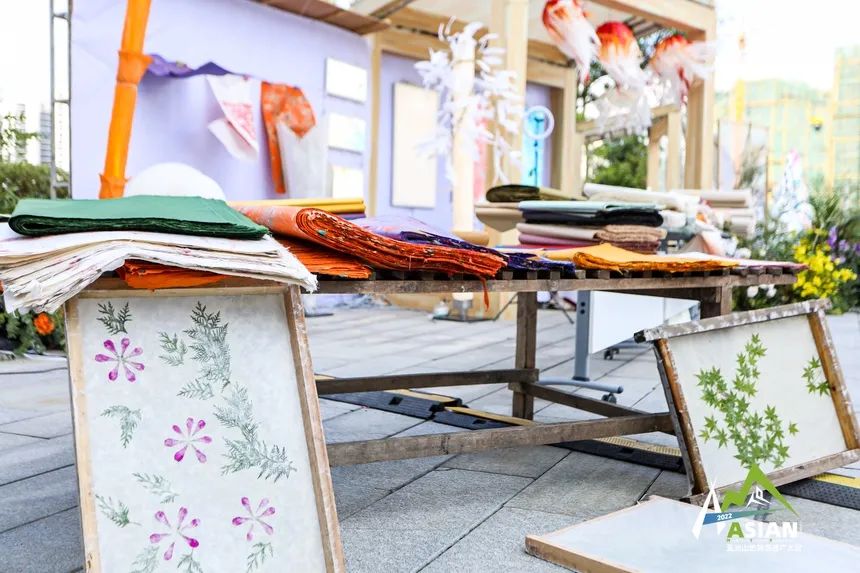 展台一字铺开,摞满了各色纸品,一旁的水槽和木架正展示着木浆变纸的神奇过程,刚摆出不久就吸引了大批观众前来体验,亲手用植物叶片制作精美的花草纸。