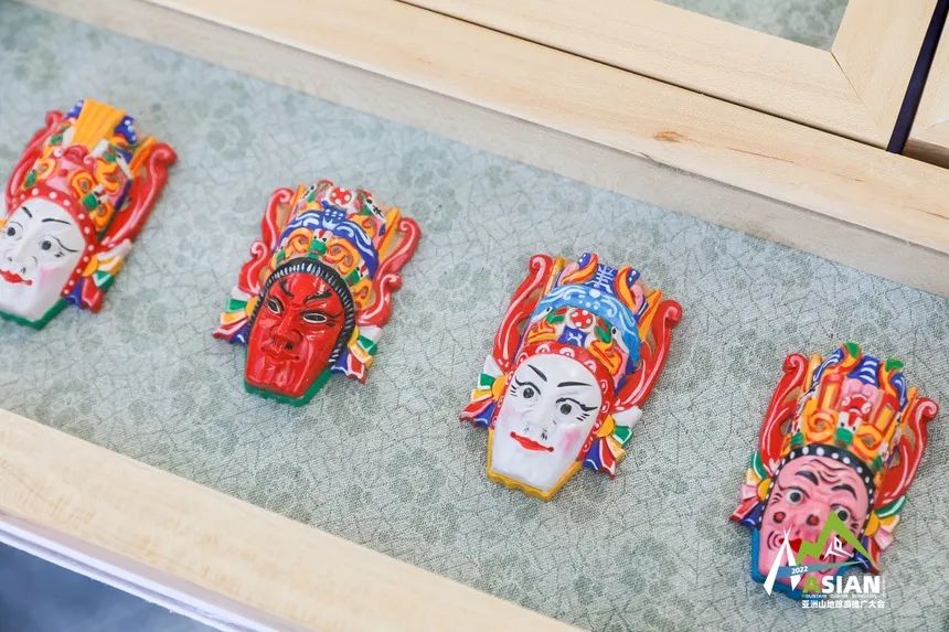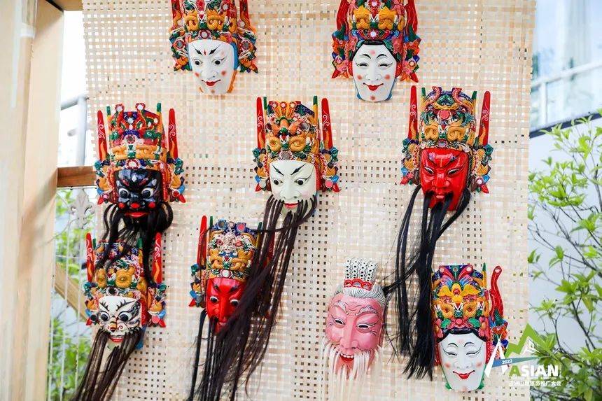 与三穗竹编相邻的,是已经历过600年传承的安顺木雕。与一旁精致细密的竹编制品恰恰相反,展架上悬挂的傩戏面具透露出的是雄浑粗狂的气场。
