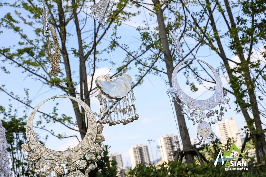 非遗传承展现场,由半人高的锡纸制作的银饰模型得众人驻足。银簪、耳环、项圈、银链、手圈、手镯、银片等施洞型台江苗族银饰随着微风轻拂,叮当作响,甚是悦耳。银饰图案之美、样式之多引得现场观众称赞不已。