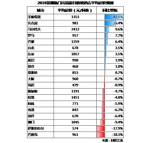 同程艺龙住宿大数据显示,今年暑期圣彼得堡、名古屋、马尔代夫、罗马、巴黎、台北、东京、悉尼、曼谷、莫斯科等热门出境游目的地的酒店预订量最大,部分城市因客流增幅较大而酒店房价出现了大幅上涨的情况,其中,圣彼得堡酒店房价以43.5%的同比增幅位居第一,成为今年暑期出境游目的地中的一匹“黑马”,其次是名古屋,平均房价同比上涨了26.4%。