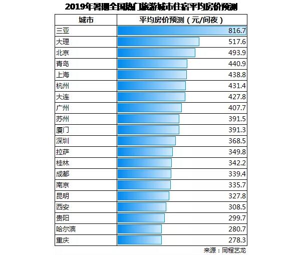 暑期旺盛的出游需求为主要旅游城市的住宿市场提供了强劲的支撑,相关城市的住宿价格(平均房价)也因此上涨。同程艺龙住宿大数据显示,今年暑期国内热门旅游目的地中,三亚以816.7元/间夜的平均房价居首,大理、北京、青岛、上海、杭州、大连、广州等热门旅游城市的平均住宿价格都在400元/间夜以上。一、二线城市因住宿设施供给充足,平均房价反而低于三亚、大理等热门旅游城市。
