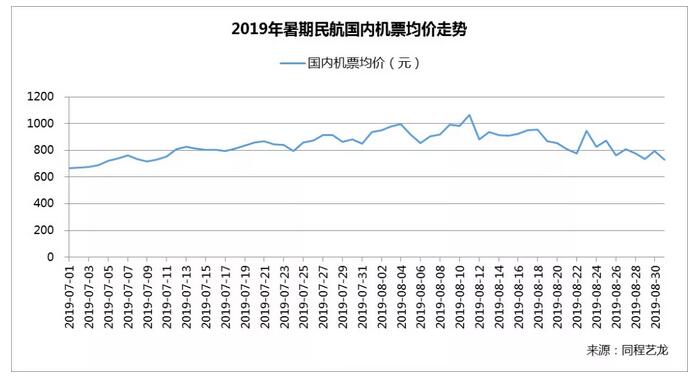 国内机票票价的相对低位出现在7月上旬,平均票价最低仅667元(不含机建燃油费),相对高位出现在8月上旬,平均票价最高达1069元(不含机建燃油费)。