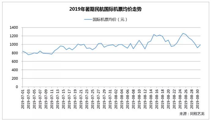国际机票票价相对低位出现在7月上旬,平均票价最低为758元(不含税费),相对高位出现在8月下旬,平均票价最高为1264元(不含税费)。