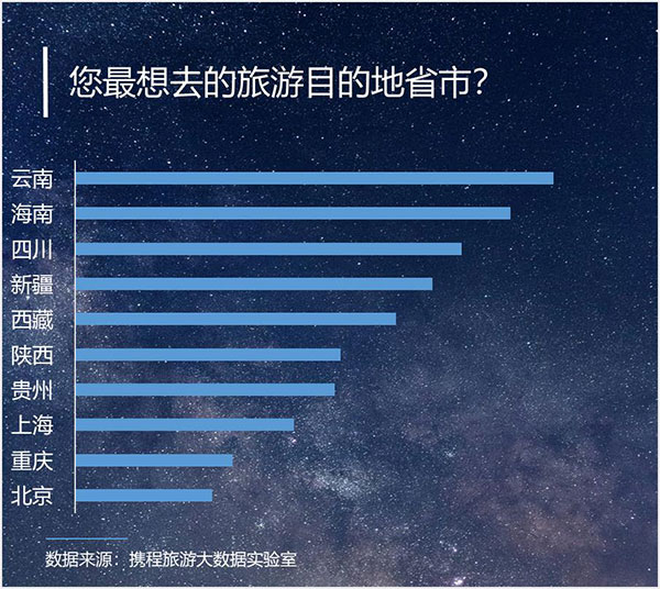 从目的地看,最受欢迎的省市依次是:云南、海南、四川、新疆、西藏、陕西、贵州、上海、重庆、北京、浙江、江苏、湖南、广东和山东。西部边疆省份、海南海岛度假预计将成为首选。