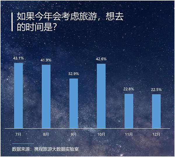 从时间上看,7月、10月、8月选择的比例最高,分别有43.1%、42.6%、41.9%。可见暑期和国庆将成为下半年旅游的高峰期。