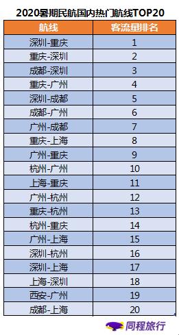 来自同程旅行的机票大数据显示,暑运期间,深圳——重庆、重庆——深圳、成都——深圳、重庆——广州、深圳——成都、成都——广州、重庆——上海等20条线路的客流量相对较大,整体上客流量较大的机场主要集中在深圳、广州、上海、重庆、成都、杭州、西安等一线城市及区域中心城市。