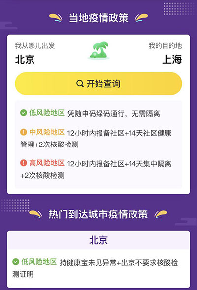 据悉,出行管控政策查询服务是同程旅行根据政府官网、疾控中心、媒体等权威信源发布的公开信息,对国内大部分城市的出行管控政策进行梳理,并与官方政策保持同步,方便用户查询参考。