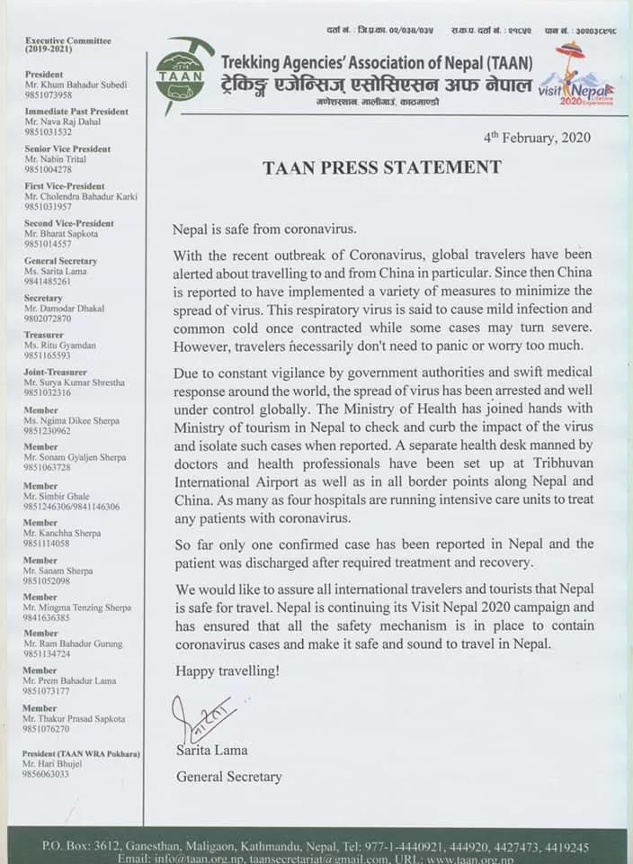 尼泊尔徒步旅行社协会(TAAN)向所有国际旅行者和游客保证,尼泊尔是安全的。尼泊尔正在进行“2020尼泊尔旅游年”活动,尼泊尔政府确保建立了所有安全机制来遏制冠状病毒病例并使旅行者在尼泊尔旅行时安全无虞。