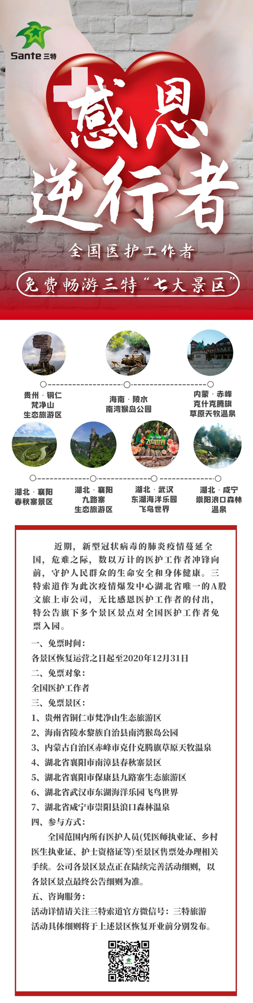 总部位于湖北武汉的A股上市公司三特索道在其官方微信平台发布《七大景区免票 感恩最美“逆行者”等你们平安归来,共赏祖国壮丽河山》,宣布旗下梵净山生态旅游区、南湾猴岛公园、克旗草原天牧温泉、东湖海洋乐园飞鸟世界、春秋寨景区、九路寨生态旅游区、浪口森林温泉七大旅游景区面向全国医护工作者实行免票政策。