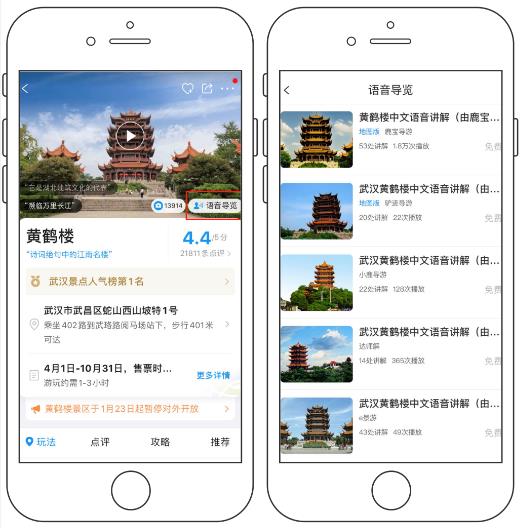 游客可以通过携程APP进入景点页面,点击景点图片中 “语音导览”图标,即可免费收听语音内容。以武汉黄鹤楼为例,点击景区页面的标签进入“语音导览”页面后,能够找到8条免费产品,游客可以从不同角度听到黄鹤楼的解读。而故宫目前也有3条免费的语音导览产品,涵盖讲解点上百处。