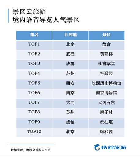而人气最高的十大境内语音导览景区分别是故宫、黄鹤楼、杜甫草堂、拙政园、陕西历史博物馆、南京博物院、云冈石窟、狮子林、都江堰景区和颐和园,榜单中景区以历史类景区为主,游客可以通过语音导览了解文物背后的故事。