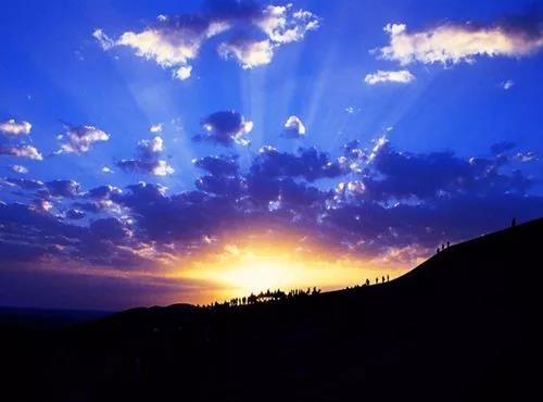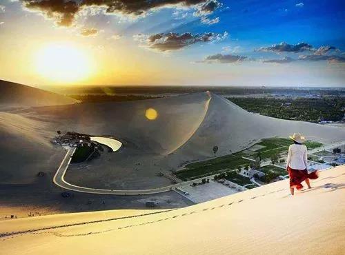 鸣沙山什么最出名?是日落,是醉美夕阳!坐在鸣沙山上看日落,在山顶上休息、玩耍、拍照、等待日落,是何等的幸福!