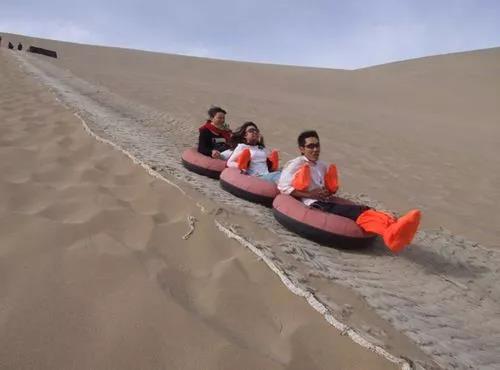 滑沙运动是继滑冰、滑水、滑雪,还有滑草之后另一新兴运动,滑沙是采用坐在滑沙板上,两腿弯曲的姿势,顺着陡立坡势飞速向下,一鼓作气地投入金色沙海,滑沙最主要的工具就是一块滑沙板。它用竹木制成,轻巧又快速,即可以进行单板单滑,也可以单板双滑。滑沙滑道为45°,乘滑沙板以每秒20米的速度下滑,随着惯性的增大,速度越来越快,惊险刺激又绝对安全。