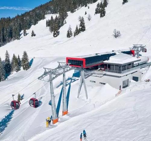 索道站房采用优雅的红色,搭配全新的火红色OMEGAV吊厢。新索道位于萨尔巴赫的Kohlmais山并已于2018年12月投入使用。新D-Line索道取代了过时的三人吊椅索道以及脉冲架空索道。其每小时可从村庄中心向萨尔巴赫的Kohlmais山运送3,200名乘客。索道位于人口稠密区,所以需要低噪声解决方案。D-Line具有出色的静音性能,能够确保当地居民不会受到索道运行的干扰。同时,乘客也将从中受益-可以坐在舒适的新型OMEGAV吊厢中,安静地向山顶出发。隔音天花板以及创新的通风理念,采用无气流新鲜空气循环,能够确保舒适的室内环境。还有符合人体工学的座椅和宽大的全景玻璃,吊厢中的乘客可领略到村庄中心和周围群山的壮丽景色。吊厢采用CWA广受欢迎的第五代OMEGA系列-整合了一系列新功能和技术细节,将品质提升到全新的水平。