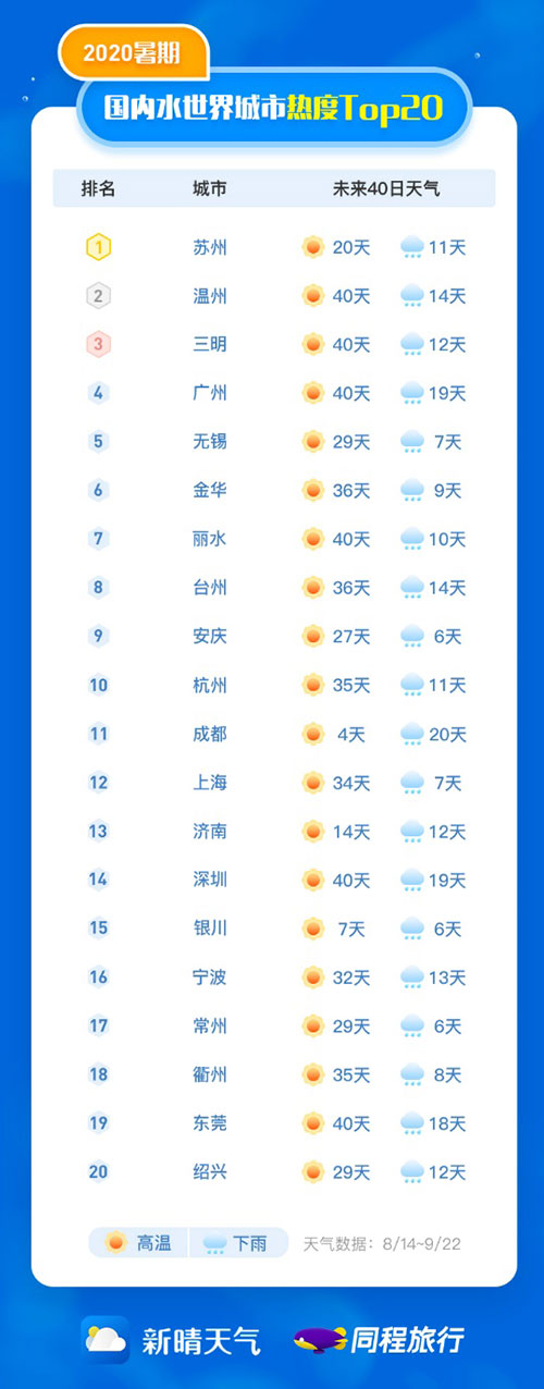 更丰富的水资源和更长的夏天使得南方城市成为暑期玩水的热门地区。《报告》数据显示,今年暑期“玩水”热度较高的城市主要有苏州、温州、三明、广州、无锡、金华、丽水、台州、安庆、杭州等20个城市,其中约九成分布在长江以南地区。结合新晴天气提供的天气数据可以看到,本地文旅资源丰富并且晴天天数较多的城市排名相对靠前,尤其是本地存在多个大型主题公园或水上公园的城市在客流规模方面排名靠前。