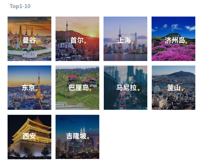 整体上,亚太地区消费者仍对于全球各个旅游目的地有出行意愿,但可以看出,亚太地区的旅游目的地热度相对更高。从亚太短途游维度看,日本和韩国是1-6月短途游心愿单中的热门搜索目的地。