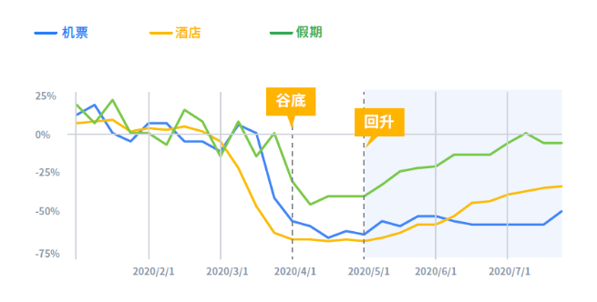 2020年上半年,全球范围内对于旅游相关话题的搜索兴趣曾陷入谷底,但目前已呈现明显增长迹象。5月份开始,消费者对旅游话题的兴趣度持续回升。7月开始,消费者对于旅游品类的部分需求,例如假期需求,已经回归去年同期水平。