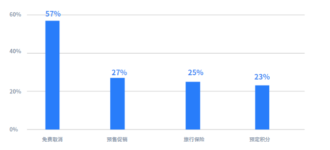 同期消费者调研显示:免费取消是对于大多消费者来说是最为重要的服务,平均而言,57%的消费者认为这是促使他们下一次预订的主要动力。此外27%的消费者关心预售促销优惠,25%的消费者关注是否涵盖保险。
