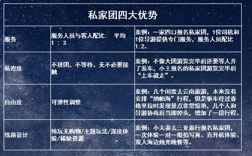值得一提的是:私家团为产品的主题、玩法、特色资源的匹配提供了空间,大团不适合做的一些产品探索:包括深度体验、创新设计、小众目的地,私家团都可以实现;比如说常规云南团走昆明大理丽江,私家团则有西双版纳+普洱、腾冲+和顺古镇等深度玩法可以选择。同样是情侣蜜月线路,私家团可以安排摄影师+化妆师1对1跟拍服务,还可以安排豪车自驾、私人游艇出海、直升机求婚等特殊体验,吸引有钱有闲想要玩深度的客人买单。
