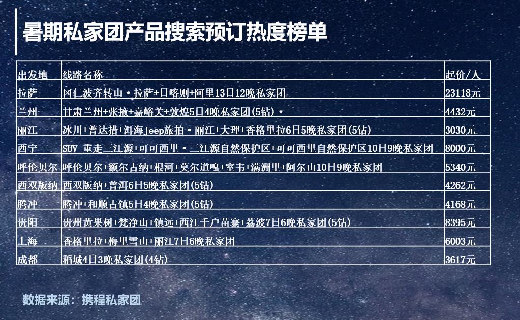 暑期哪些私家团产品预订搜索人气最高?携程发布的“暑期私家团十大人气线路”,覆盖西藏、甘肃、云南、青海、内蒙古、贵州、上海、四川,拉萨+日喀则+阿里13日12晚私家团、甘肃+张掖+嘉峪关+敦煌5日4晚私家团、丽江大理香格里拉6日5晚私家团等产品人气最高,价格主要在3000多元到5000多元,西藏冈仁波齐转山13日私家团,价格23000多元依然热卖。
