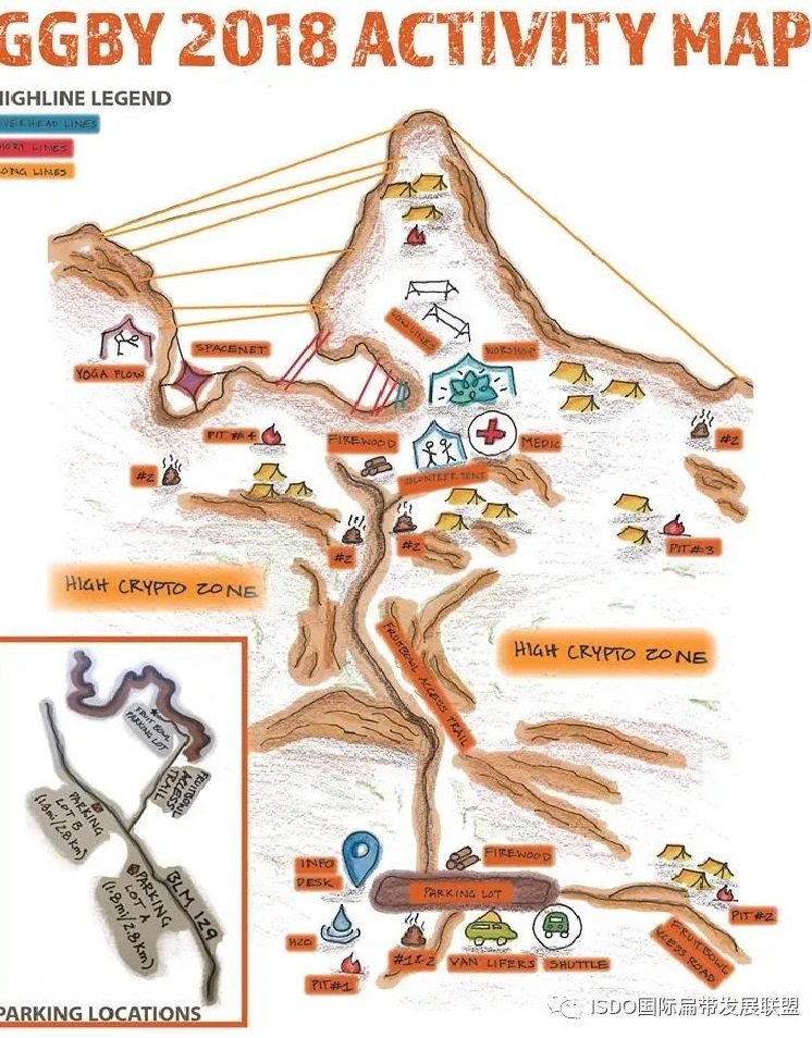 本届GGBY高空扁带大会由加拿大SlacklifeBC、瑞士Slacktivity、德国RaedSlacklines等六个扁带组织共办,共搭建了14条高空扁带和2个高空织网。
