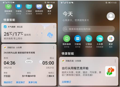 同程艺龙通过华为快服务智慧平台将行程提醒服务接入到华为负一屏的情景智能后,用户在情景智能中订阅“同程艺龙”并绑定账号后,即可同步同程艺龙基于App、微信小程序、快应用的火车票订单,随时掌握订单动态。目前,用户无需打开APP或小程序等应用,同程艺龙会在特定的情景下,以更直观的卡片形式,智能、实时的展示用户的火车票订单进程和结果,主动更新出行状态,提醒用户合理安排出行时间。未来,还将陆续接入酒店、景区门票等全出行全场景订单。