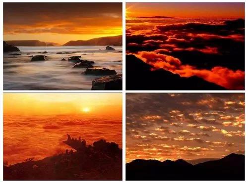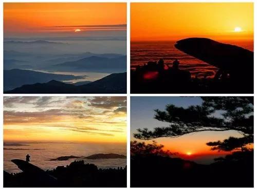 旭日东升是泰山最迷人的奇观。拂晓,天晴气朗,万壑收暝,东方一线晨曦由灰暗变淡黄,又由淡黄变成橘红。继而,天空云朵赤紫交杂,瞬息万变。满天彩霞与地平线上的茫茫雾气连为一体,云霞雾霭相映。日轮掀开云幕,冉冉升起,宛若飘荡着的宫灯。顷刻间,金光四射,群峰尽染。然而,这只不过是一般的陆地日出,而那海上日出,更为壮观。赤轮乍启,海面半吞半吐,欲上而止,跳荡恍惚,仿佛有二日捧出。有时还能看到罕见的日珥。