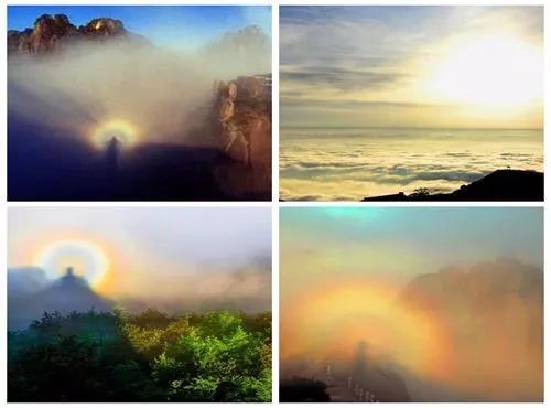 每当云雾弥漫的清晨或傍晚,游人站在较高的山头上顺光而视,就可能看到缥缈的雾幕上,呈现出一个内蓝外红的彩色光环,将整个人影或头影映在里面,恰似佛象头上方五彩斑斓的光环,故得名“佛光”或“宝光”。