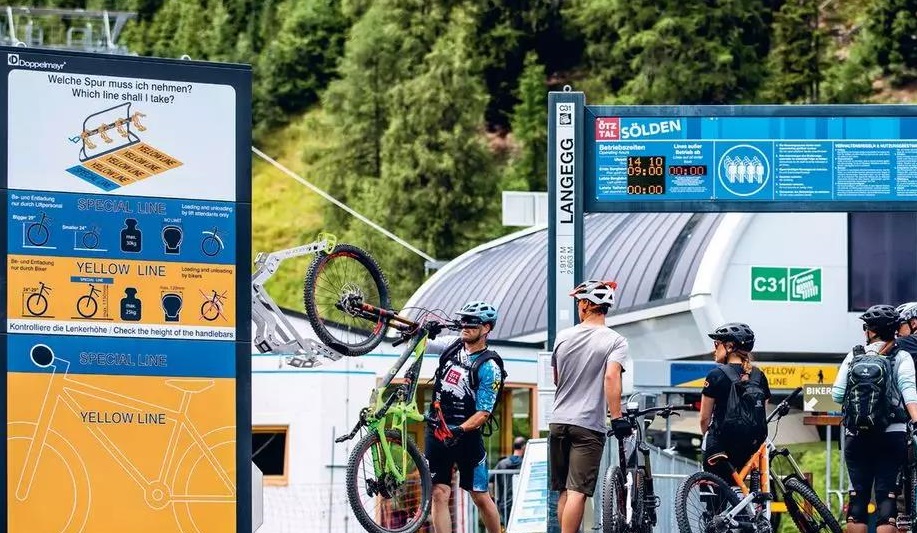 索尔登度假胜地在2000年初建Langegg吊椅索道时,设计为仅供冬季滑雪使用。自从2008年夏季以来,自行车手们也能纷纷使用该索道,因为其安装了最新版多贝玛亚自行车夹。Langegg索道连接了Gaislachkogl和Giggijoch路段的山地自行车车道,这加强了“自行车之王索尔登”的称号。对于自行车爱好者而言,这意味着路线更长、变道更多。
