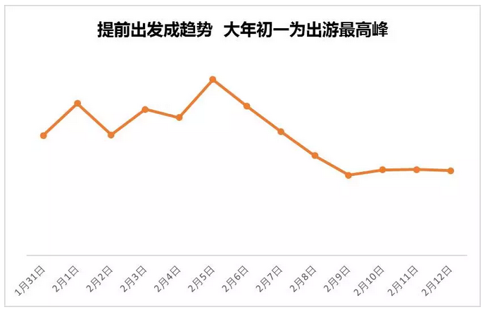 今年春节长假出行的游客中,近5成订单选择提前出发或者延后返回拼假出游。根据截至2019年1月7日的携程跟团游、自由行订单数据,从1月31日起,出游人数就显著上升,特别是欧美等出境游开始进入高峰。出游最高峰出现在大年初一(2月5日)。