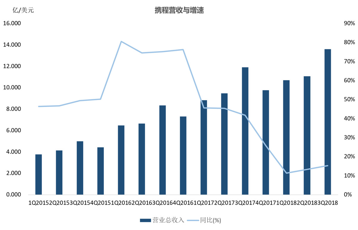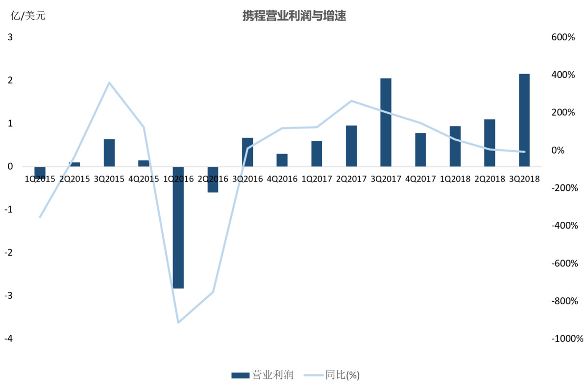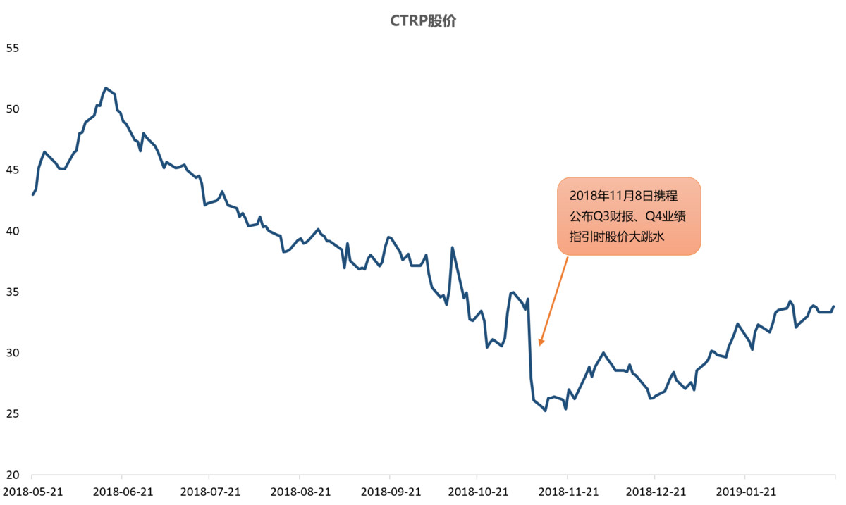 在宏观经济逆风之下,旅游相关企业自然表现不佳,OTA预订平台携程首当其冲。携程在2018年11月8日公布Q3业绩的时候,除了盈利转负外,更重要的是对下一个季度(2018Q4)非GAAP营业利润率的预期指引,仅为0-1%,而上一季度(2018Q3)这一数字为20%,这造成了携程股价当日跳水19%。