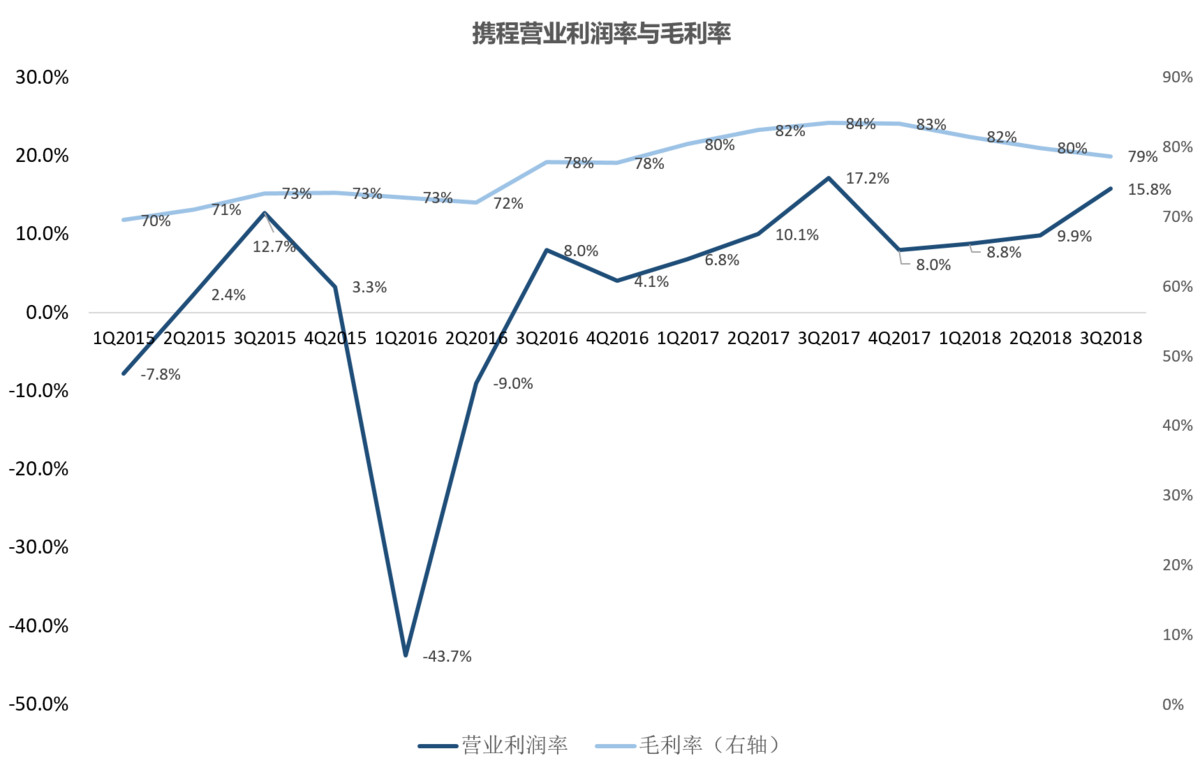 民航局在2017年禁止机票“搭售”的政策,也令携程的盈利性受损。自2017年Q3开始,携程的毛利率迎来拐点,进入下降通道。