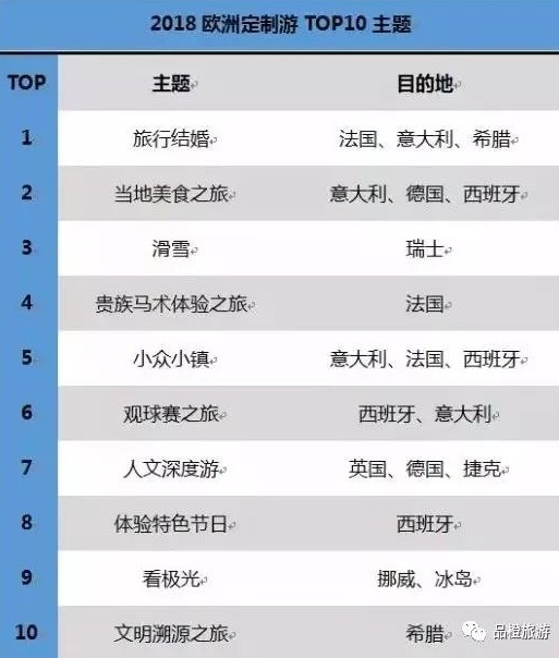 根据游客的定制需求,十大欧洲定制游主题备受关注:旅行结婚、当地美食之旅、滑雪、贵族马术体验之旅、小众小镇、观球赛之旅、人文深度游、体验特色节日、看极光、文明溯源之旅。