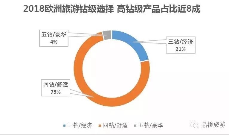 从产品的钻级来看,2018年通过携程和华程国旅集团预定的欧洲旅游产品中,高钻级产品占比近8成,其中,四钻舒适性占比75%,五钻豪华型占比4%。