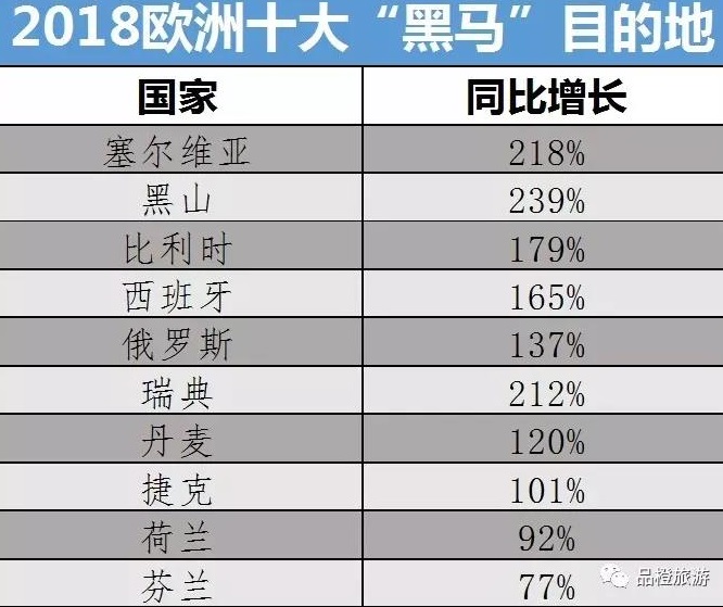 旅游人次增量最多的欧洲目的地国家有:塞尔维亚、比利时、西班牙、俄罗斯、波兰等。作为欧洲首个对华免签国,塞尔维亚近年来已成为中国新兴欧洲游目的地,其相对较低的旅游花费和欧洲风情颇得游客青睐。黑山推出的有条件免签政策进一步方便了国人赴黑山旅游。得益于中俄双方政治交好以及2018年世界杯的举办,2018年赴俄旅游人数蹿升。北欧五国近几年越来越受到中国游客关注,其中芬兰人气最高,近72%的人数选择芬兰一地,主要前往首都赫尔辛基、拉普兰地区看极光、游览圣诞老人村等。
